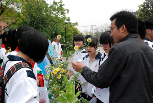 2011年4月20日高2013届开心农场成员将亲手种植的当季蔬菜:莴苣、豌豆花、小葱、冬寒菜、小白菜、箩卜苗、芹菜、茼蒿菜,从幼苗到花果,不同生长期的植株以实体的形式展览。眼前惊现的“雏菊”居然为茼蒿菜的花,“莴苣”与“生菜”是亲戚,“韭菜” 和“麦苗”长相相似但前者是蔬菜后者是粮食。为了本次活动农场成员做足了功课,精心准备了展板、宣传资料,为参观的师生耐心的讲解了参展蔬菜的习性、食用价值、发生在树德农场里的开心故事。