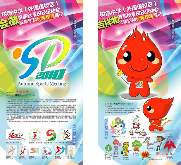树德中学(外国语校区)首届秋季田径运动会将于10月28日举行。此次运动会会徽、吉祥物征集活动自开始以来,同学们热烈响应,积极投稿,共收集作品113件,其中有22件作品入围,通过综合评比,高一2班黄雄壮设计的会徽和初一6班黄瑞玲设计的吉祥物最终脱颖而出,成为外国语校区首届秋季田径运动会会徽和吉祥物: