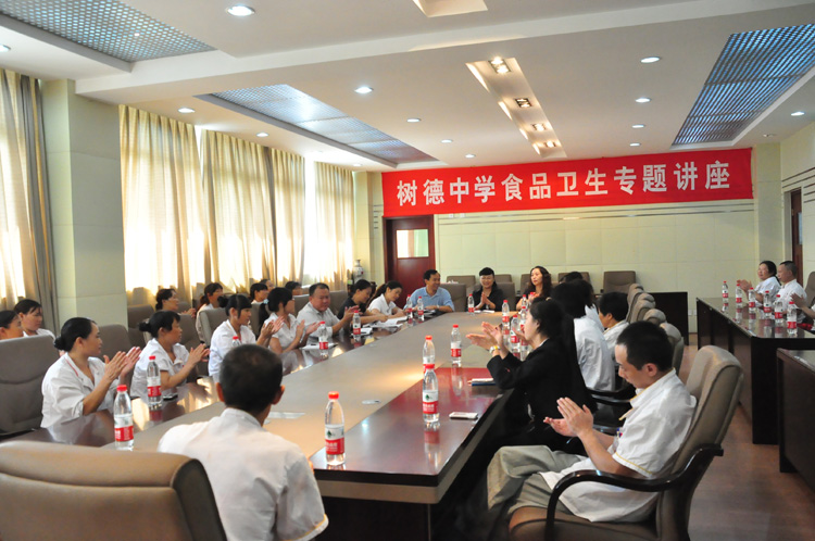 9 月 14 日 下午 ,树德中学食堂食品卫生安全专题讲座在艺术类一楼会议室举行。樊晓彬副校长代表学校讲解学校办学理念,雅风阁食品检疫部部长唐琼英就如何加强食品卫生安全作了发言,窦志副主任总结开学食堂工作情况并宣读了树德中学社会化单位员工行为规范,校医王晓玲老师就食堂员工个人卫生知识进行了培训,谭忠友主任主持会议并作了总结发言,食堂全体员工听取了讲座。