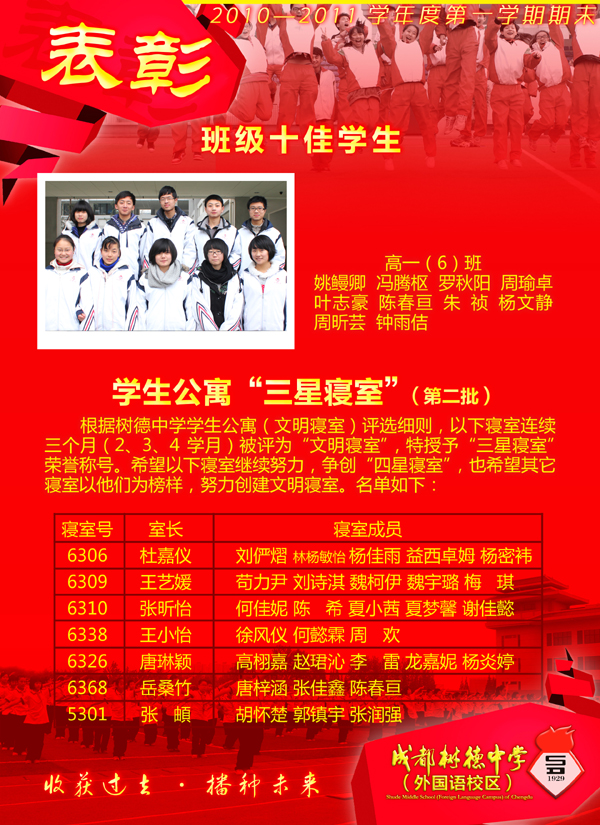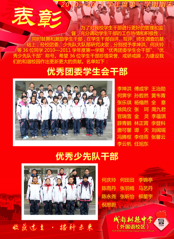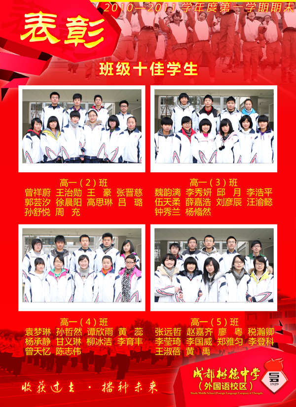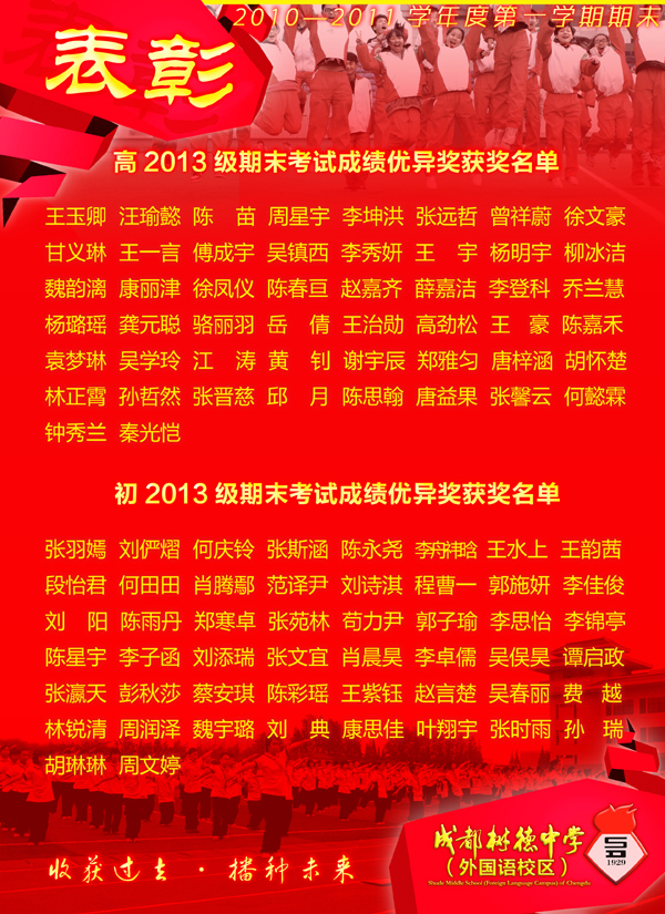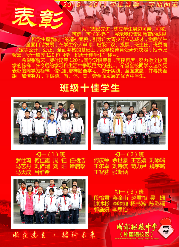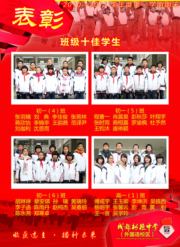 一学期匆匆而过,过去的一学期是短暂的,但大家的成长是显著的收获是巨大的,为更好的总结过去、展望未来,树德中学外国语校区于1月22日上午8时以校园广播的形式举行了一次意义深远的散学典礼。大会由德育处陈铁军主任主持。大会在雄壮的国歌声中正式开始。为回忆过去的点滴,对一学期的校园生活做一个简单回顾,学校特地制作视频短片,让同学们在回忆中总结过去。军训时的辛苦,学习时的坚强、活动时的激情全都呈现在短短的视频中,同学们在视频中看到自己在学校生活的点滴,在愉快的氛围中感悟于过去。学生代表何霁宇在大会上发言,他讲到:军训的严厉让我们学会了坚强,学会了适应,面对每次的考试结果,我们能认真的总结反思,成功了不骄傲,失败了不气馁,因此,我们更加成熟更加理性。在过去的一学期,我们以积极的行动展示了我们的才华,我们的优秀,我们可以满怀自信地说:作为树德中学外国语校区的第一批学生,我们不辱使命!随后,学校对李坤洪、何庆玲等36名同学给予了“优秀学生干部”的表彰,对张馨云、何霁宇等120名同学给予了“班级十佳”的表彰,对在期末考试中取得优异成绩的前30名同学进行了表彰。最后,德育处陈铁军主任做总结讲话,他全面而细致地对一学期的学习、生活、活动做了总结,并对同学们在寒假的生活做了详细安排,他讲到:一个假期,可以彻底改变一个人,如果把握好了,你将取得巨大的进步,如果把握不好,你将会偏离成长的正常轨迹!请大家珍惜假期,认真度过一个有意义的寒假。在讲话最后,陈主任请各位班主任老师站在讲台的中央,让全班同学回忆在一学期中班主任陪伴我们走过的一点一滴,提议全体同学真诚的道一声:老师,辛苦了!最后大会在激扬的校歌声中圆满结束。此次散学典礼是成功的,是意义深远的,我们以简单的形式对过去的学习和生活做了全面总结,引导同学们去反思,在感悟过去的过程中以更加正确、更加积极的姿态走向明天!