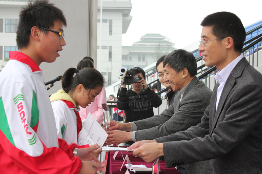 树德中学(外国语校区)第一届田径运动会于2010年10月28日下午2点30分隆重开幕。树德中学校长陈东永、外国语校区执行校长唐佳庆、校长助理朱志刚、德育处主任陈铁军,办公室主任宋德波、教务处副主任刘涛出席此次开幕式。全校师生参加此次盛会。