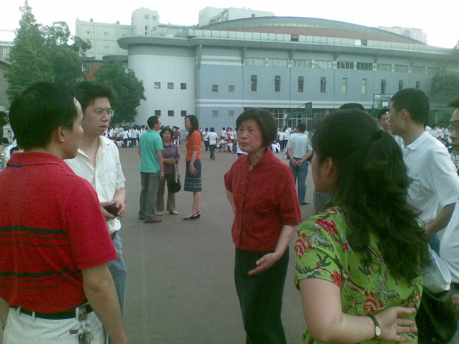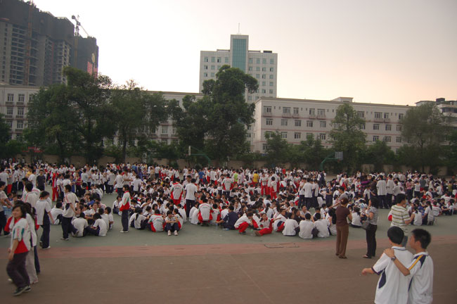 5月12日中午地震发生后,我校师生快速安全有序撤离到操场。尽管地震来得很突然,但大家都互相都提醒着不要慌张,不要乱跑,而是有序地往操场上跑。令人感动的是,撤离过程中一些男生在过道上大声喊道:“让女生先走!!”。一位坐在轮椅上行动不便的女生被班上一群男生包围着,看得出来,大家没有只顾着自己逃跑,将她抢了出来,陈东永副校长疏散全部学生安全撤离到操场后才离开教学楼。学校及时对撤离到操场的学生进行了组织,迅速稳定了大家的情绪,5点后,学校组织大家分批离校。