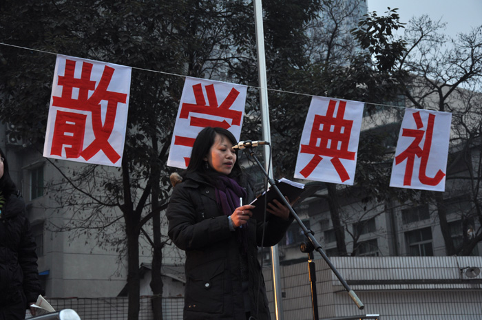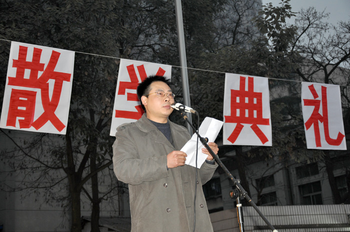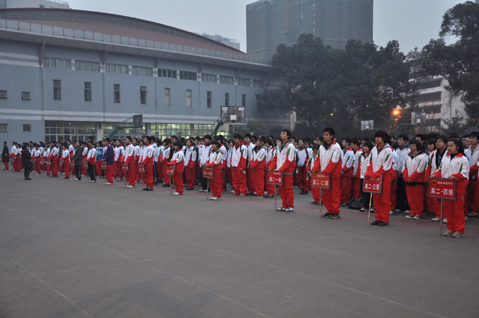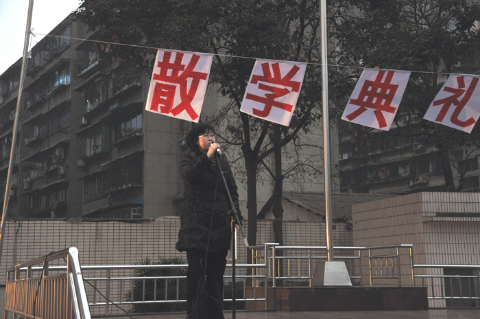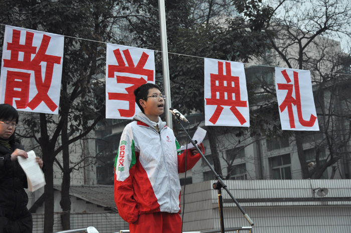 1 月 30 日 上午8点,09—10学年上期散学典礼在操场隆重举行,德育处田勇君主任主持仪式,文波主任作了《人格的力量》的讲话,李丹主任提出寒假期间的常规要求,学生会副主席谢颜聪同学代表校团委和学生会发出了“科学学习、快乐寒假”寒假生活倡议。