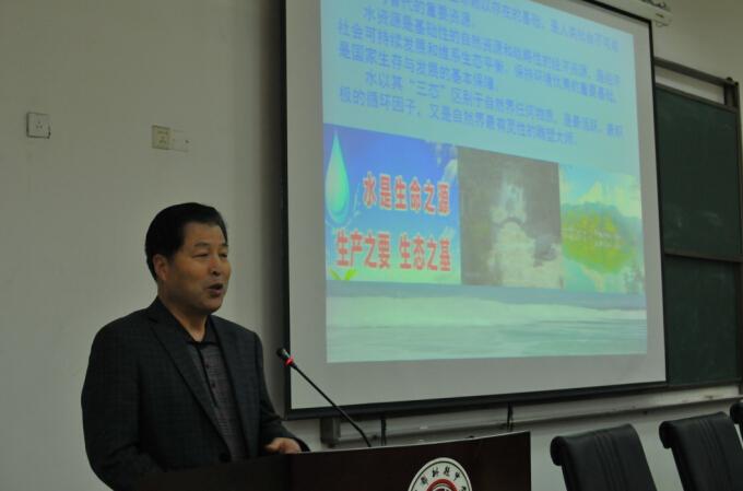 刘俊民教授主讲题目是“中国水资源及最严格的水资源管理”,他在报告中介绍了中国水资源的现状、水资源的特点、水资源开发利用情况、当前面临的水资源危机及国家实施最严格的水资源管理等知识。刘教授强调国家政策是政府层面宏观调控措施,只有落到实处才能算真正实现了最严格的水资源管理,这就希望每一位同学从身边做起,节约资源、保护环境。