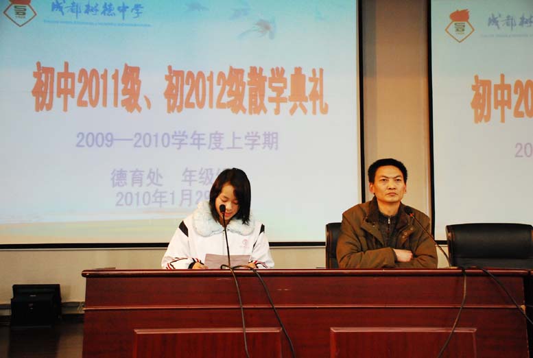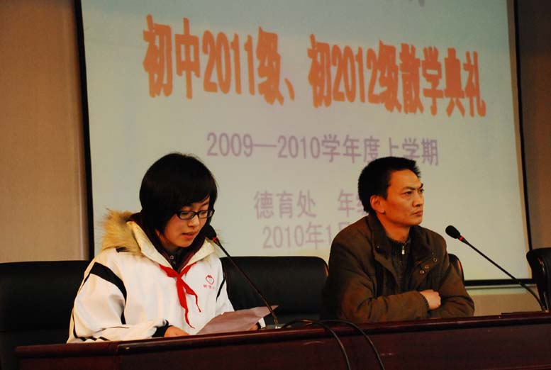 散学典礼由德育处组织进行。同学们首先观看由学校校园电视台录制的《成长的足迹——2009—2010学年上期德育活动综述》,回顾了一个学期以来参加的各项活动,回忆成长中的点点滴滴。