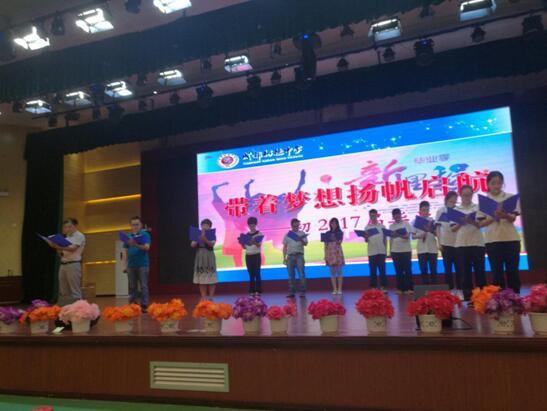 2017年6月14日晚19点,树德中学(光华校区)初2017届在学术厅举行了毕业典礼。晚会以“带着梦想•扬帆启航”为主题,激情,振奋,感人!树德中学党委书记陈华忠,副校长朱志刚,德育处吴金全主任,教务处副主任、初2017届分管干部李芝主任,德育处文军副主任、白德惠副主任、欧永副主任以及初2017届全体师生、家长参加了毕业典礼。德育处吴金全主任主持了典礼。