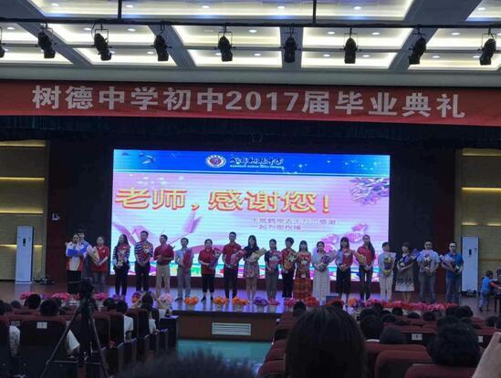 学生为初2017届全体教师献上鲜花,并热情拥抱自己亲爱的老师。学生代表丁子琪发表谢师感言,表达了对树德情谊、同学情谊、师生情谊的不舍。分管年级干部李芝主任代表教师送上对孩子们的祝福,深情回忆了三年同学们的点点滴滴,祝愿同学们明天更加阳光!更加灿烂!更加美好!