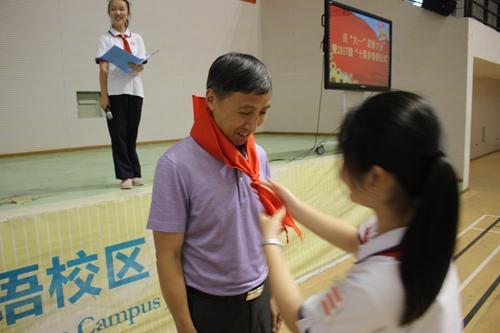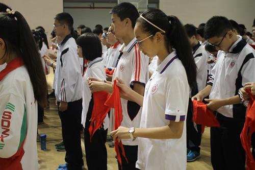 庄严的退队仪式开始,初二年级全体同学最后一次面对少年先锋队队队旗庄严宣誓;在领队同学的带领下,所有同学向所有老师和家长道出一声声的“谢谢你们!”,这感谢声响彻体育馆上空,震撼在每个人心间。紧接着,初二全体同学集体唱响队歌,在队旗的见证下,轻轻摘下红领巾,叠放在自己的手心。