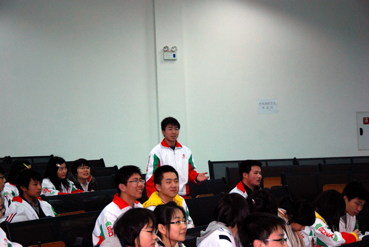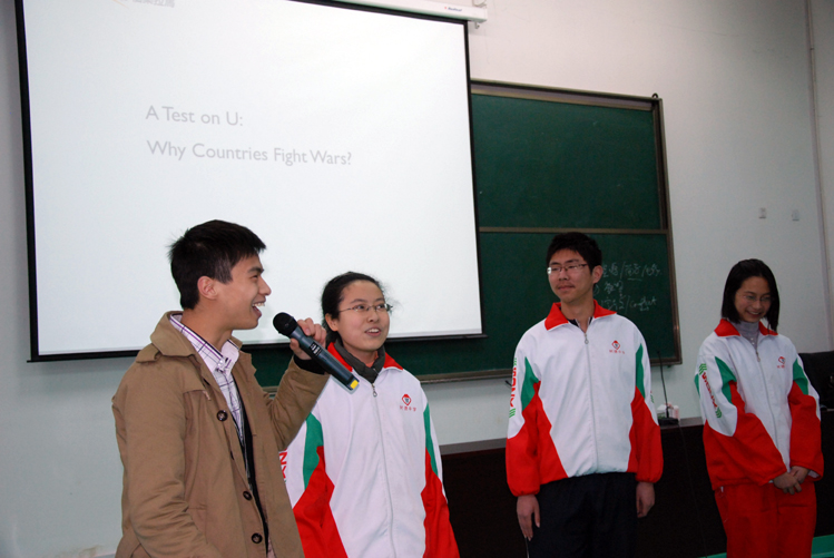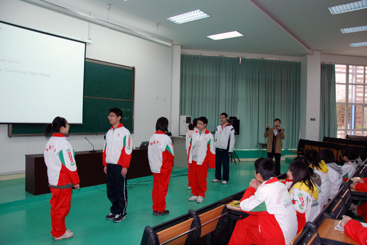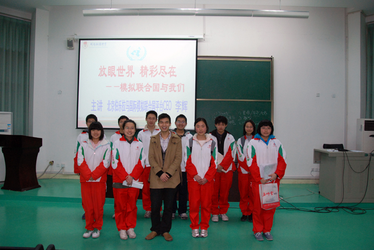 3 9 下午6:00,应校团委的邀请,来自北京伯乐拉马国际模拟联合国平台CEO李辉老师在我校学术厅进行了主题为“放眼世界,精彩尽在——模拟联合国与我们”的讲座。讲座中,李辉老师生动地向同学们介绍了模拟联合国的起源,以及在国外、国内的发展。为了让同学们亲身体验一下模拟联合国,李辉老师以“Why Countries Fight Wars?”为题,邀请6位同学分三组,分别代表6个国家的“总统”决定和平还是战争,活动中精彩的点评赢得同学们的阵阵掌声和笑声。同时,结合模拟联合国中应具备的能力素质,李辉老师向同学们介绍平时应多积极主动交流沟通、积累知识经验、强化英语训练,在系列比赛活动以及“模联”实战中不断提升自己。