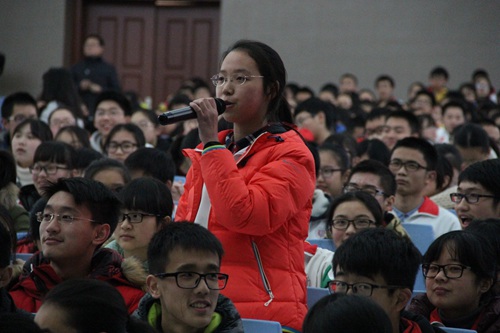 Eric Mazur教授话音刚落,在场学生便按捺不住激动的心情,纷纷起立向教授提出自己学习后的问题。问题涉及方方面面,包括生活中光纤宽带带给自己的疑惑,纳米线在日常或医学领域的应用现状,中美两国教育和文化差异等生活思考和疑惑。Eric Mazur教授鼓励并赞赏着学生们的提问,并一一解答。