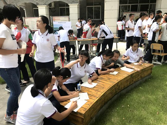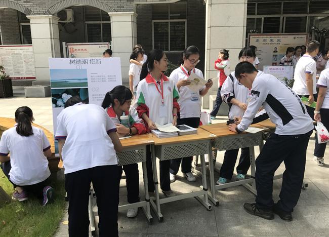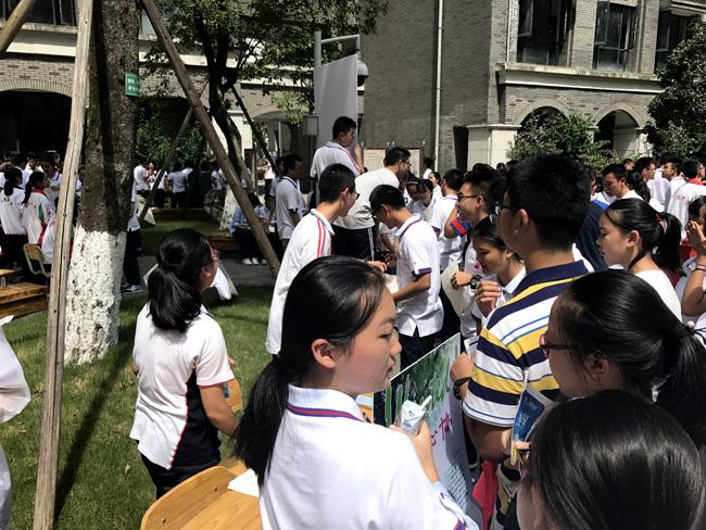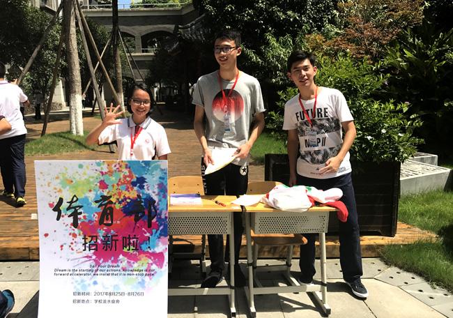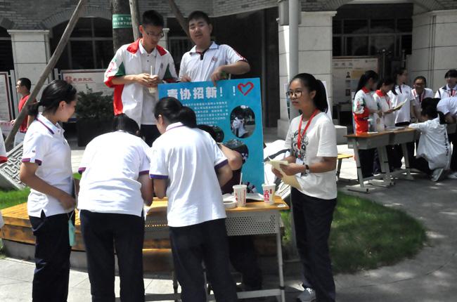 表针刚走过12:30,原本空荡荡的小广场一下子变得门庭若市。高一的同学们在一个个招新点间不断穿行、询问,将展板上的介绍看了一遍又一遍,只为找到一个合适自己的部门。高二学生会的同学们也是频出奇招,树德电视台的台长在水泄不通的群众中高声宣讲,“校园电视台,有爱在一起”;体育部的部长们自信的展示着体育文化活动阳光的风采;校报《树德里》的主编们用自己充满文艺气息的一片清凉吸引来无数同学的驻足聆听;远处的流水亭里,广播站的站长们已经抢先一步开始了自己部门的招新面试……