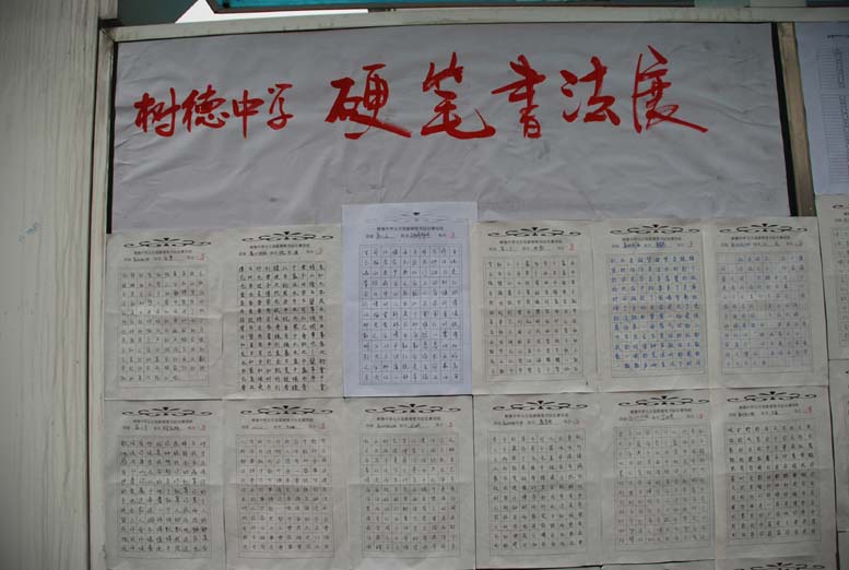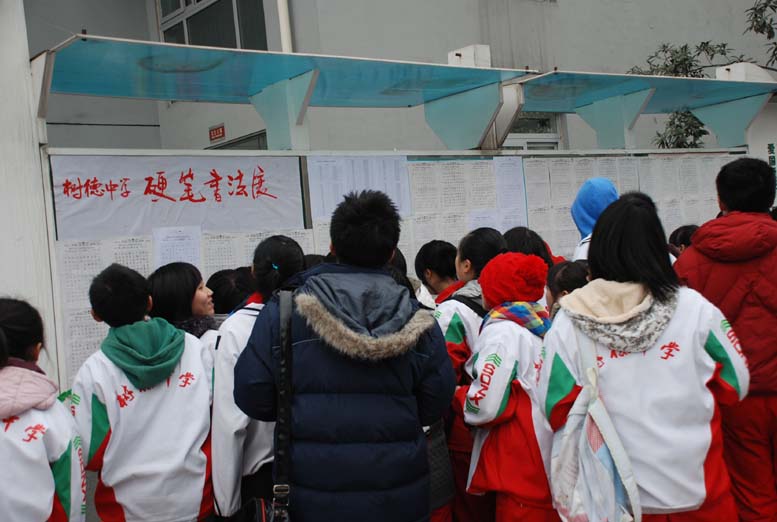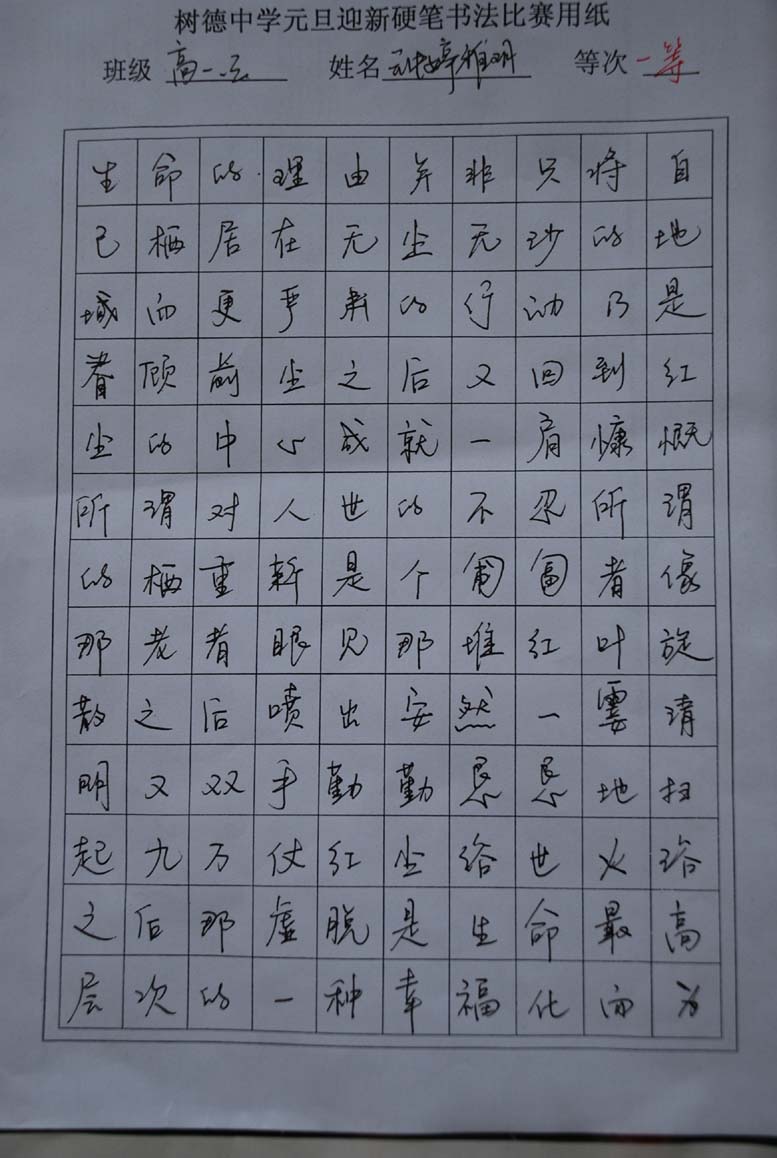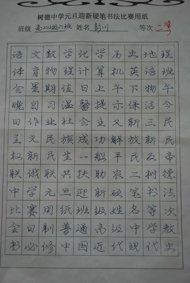为培养学生对祖国文字的感情,提高我校学生汉字书写水平,我校语文教研组举办了“树德中学元旦迎新硬笔书法比赛”。四个年级(包括初中组)踊跃参赛,分别评出一等奖15名、二等奖20名、三等奖30名。比赛的所有获奖作品均在学生公寓宣传栏展览,引起了全校学生的广泛关注,激发了全校学生新一轮练字热情。