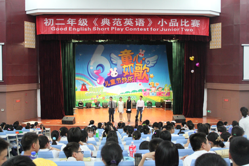初二同学精彩的表演为大家呈上了一场美轮美奂的视听盛宴。十二个节目,无论是剧本的编撰、服装的搭配、背景的制作还是舞蹈音效的设计,无不展现了同学们扎实的语言功底和不凡的艺术禀赋。比赛中亮点纷呈,精彩不断:比赛在一班同学惟妙惟肖的倾情表演《Walrus joins in》中拉开帷幕;二班同学在《Princess Pip's holiday》中滑稽搞怪、灵动活现的表演博得了现场阵阵掌声;三班同学在《The masked cleaning ladies of Om》中精湛的演技、富有感染力的语言,备受观众瞩目;四班的《The masked cleaning ladies meet the pirates》,语音优美纯正,表演入木三分,让整个舞台沸腾;五班同学完美演绎了《Walrus joins in》,激起观众共鸣,让全场的气氛达到了高潮;六班同学的《Cornflake coin》表演清新,独树一帜,令人难忘。